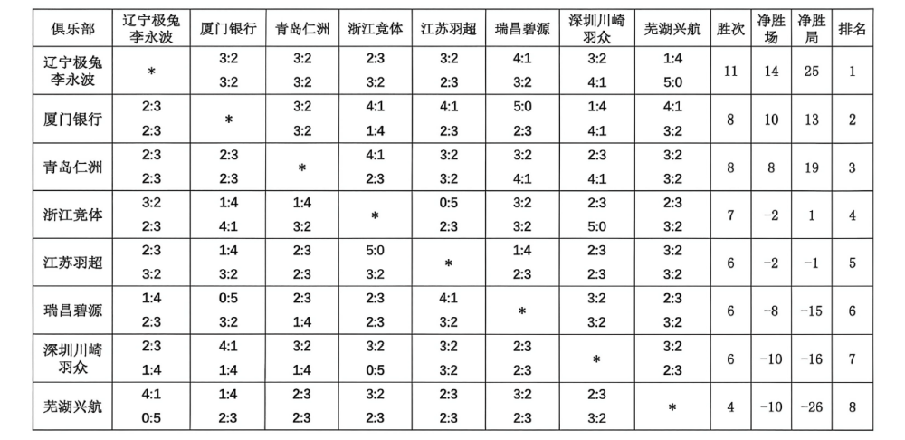 此前,各俱樂部在深圳、杭州、蘇州、蕪湖四個賽區(qū)已完成14輪常規(guī)賽比拼,遼寧極兔李永波隊(duì)、廈門銀行隊(duì)、青島仁洲隊(duì)、浙江競體隊(duì)排名前四,晉級總決賽。蕪湖興航隊(duì)排名第八,遭遇降級。