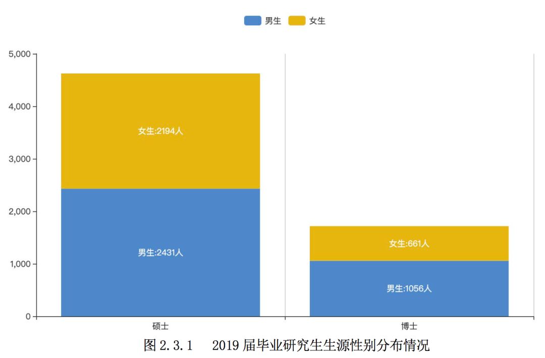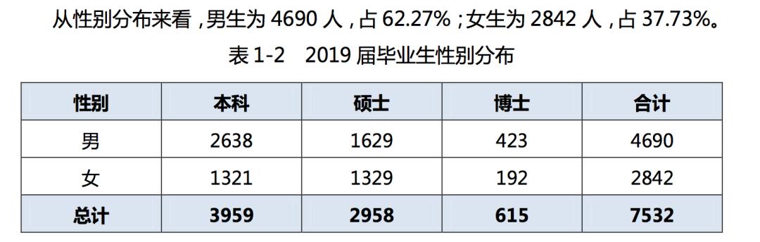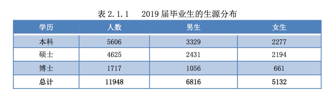 浙江大學(xué)2019屆畢業(yè)生共有11948人。其中,本科生5606人、碩士生4625 人、博士生 1717 人;男生6816人、占 57.05%,女生 5132 人、占 42.95% 。
