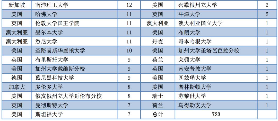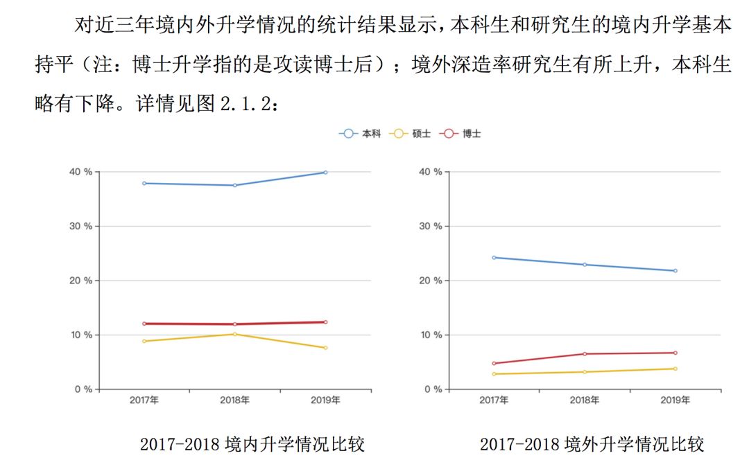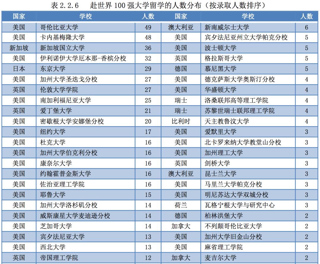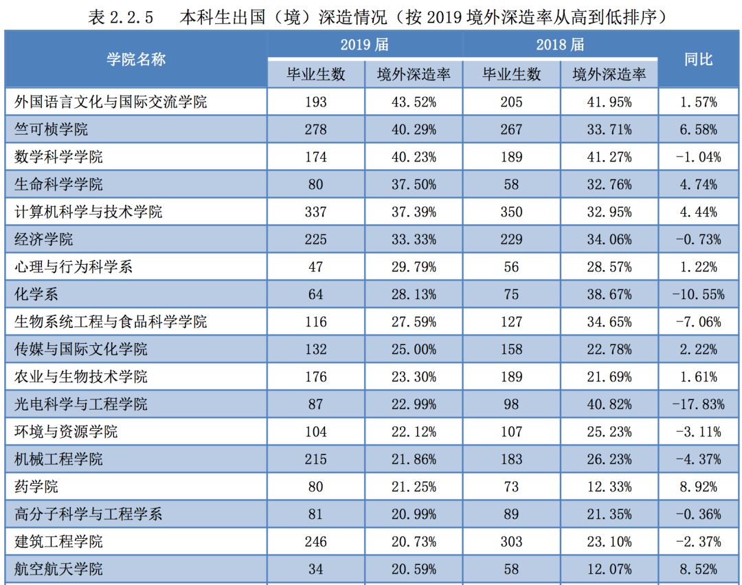 從本科生的情況來(lái)看,清華大學(xué)2019屆本科生出國(guó)(境)深造人數(shù)699人,出國(guó)(境)深造率為24.6%,相比2018屆畢業(yè)生的26.3%下降1.7個(gè)百分點(diǎn);浙江大學(xué)2019屆共有 1219 名本科畢業(yè)生出國(guó)(境)深造,占本科畢業(yè)生總數(shù)的 21.74%, 較去年下降了 1.12%;上海交通大學(xué)2019屆本科生出國(guó)(境)深造人數(shù)870人,出國(guó)(境)深造率為24.46% ,相比2018屆本科生的26.3%下降近1.8%。其他高校南京大學(xué)、西安交通大學(xué)和哈爾濱工業(yè)大學(xué)出國(guó)(境)深造情況也類似。