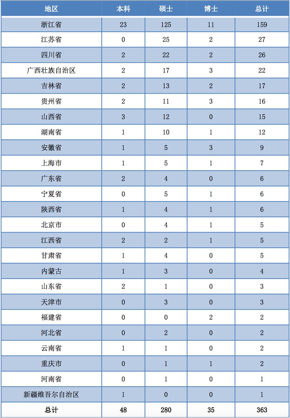 在實(shí)際就業(yè)的 7332 位(不包含部分定向委培畢業(yè)生)畢業(yè)生中,主要地區(qū)流 向依然為浙江、上海、廣東、北京、江蘇等一線或發(fā)達(dá)地區(qū)。其中,留在浙江省 內(nèi)就業(yè)的畢業(yè)生占到近六成;在上海、廣東、北京、江蘇就業(yè)的畢業(yè)生占比 26.92%。
