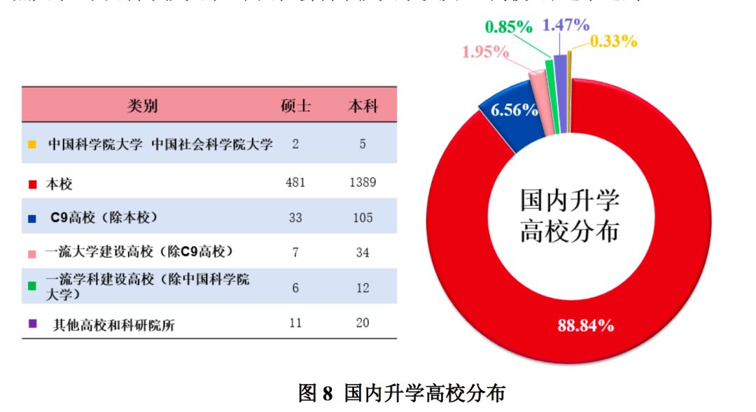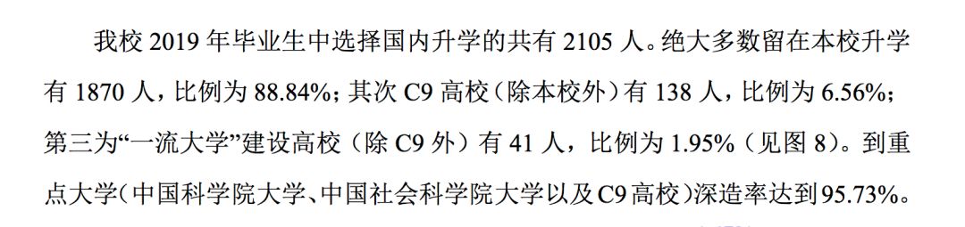 2019 屆共有 2137 名本科生升學(xué)至境內(nèi)“雙一流”高校(A 類)和中國(guó)科學(xué) 院(包括中國(guó)科學(xué)院大學(xué)),占本科畢業(yè)生境內(nèi)升學(xué)人數(shù)的 95.74%。