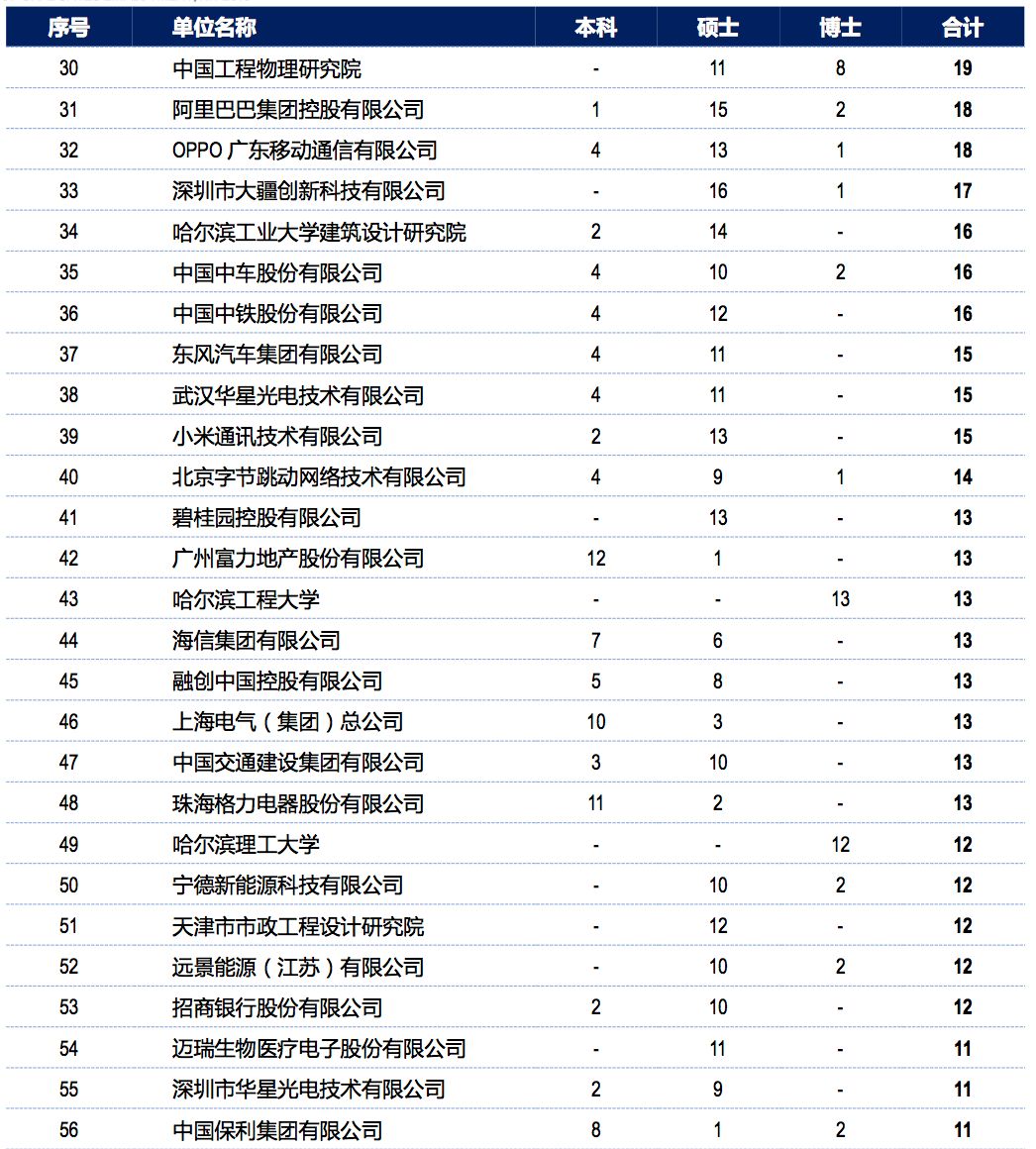 共有 56 家單位錄用浙江大學(xué) 2019 屆畢業(yè)生在 15 人及以上,這些單位共接收畢業(yè)生 2792 人,占實(shí)際就業(yè)人數(shù)的 38.08%。具體人數(shù)分布如表 2.1.12: