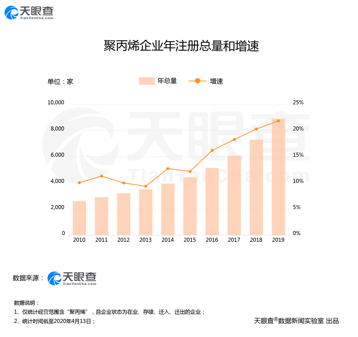 從成立時(shí)間來(lái)看,2010-2015年,聚丙烯企業(yè)增速基本保持在10%左右。自2016年開始,增速達(dá)到16.2%,此后增速逐年提升,至2019年增速已達(dá)21.84%。