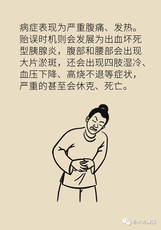 急性胰腺炎病癥表現(xiàn)為嚴(yán)重腹痛、發(fā)熱。貽誤時機(jī)則會發(fā)展為出血壞死型胰腺炎,腹部和腰部會出現(xiàn)大片淤斑,還會出現(xiàn)四肢濕冷、血壓下降、高燒不退等癥狀,嚴(yán)重的甚至?xí)菘?、死亡?/p>