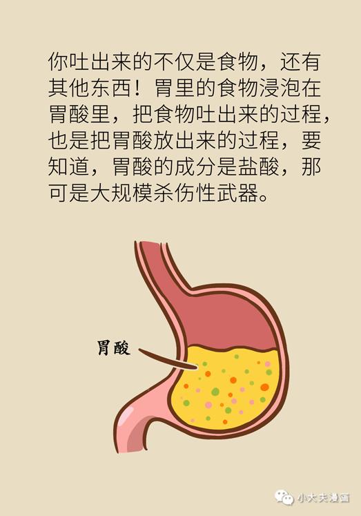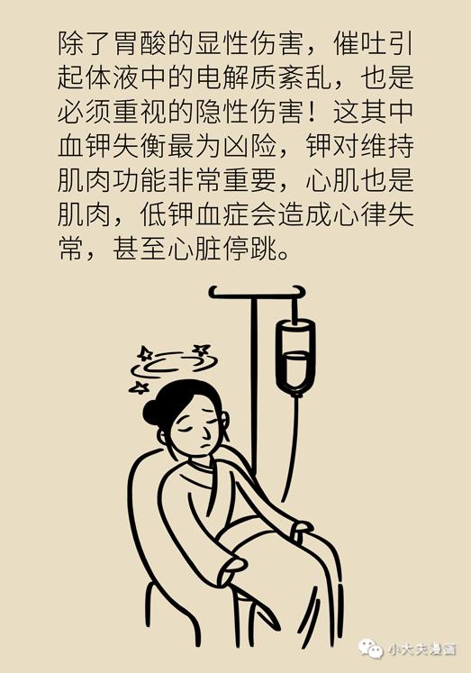 胃里的食物浸泡在胃酸里,把食物吐出來的過程,也是把胃酸放出來的過程,要知道,胃酸的成分是鹽酸,那可是大規(guī)模殺傷性武器。除了胃酸的顯性傷害,催吐引起體液中的電解質(zhì)紊亂。這其中血鉀失衡最為兇險,鉀對維持肌肉功能非常重要,心肌也是肌肉,低鉀血癥會造成心律失常,甚至心臟停跳。
