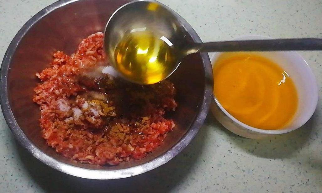 最后再加入適量的油到肉末中,用筷子攪拌均勻,讓食用油牢牢鎖住肉沫中的水分,不讓其流失。