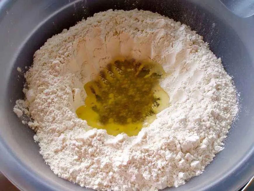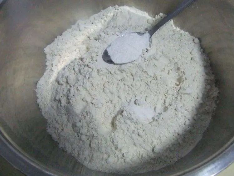 第一步:高筋面粉里加入食鹽,加鹽和面能讓面皮勁道。