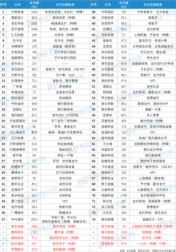 據(jù)東方財(cái)富資料顯示,截止至發(fā)稿時(shí),A股移動支付板塊成分股共74只。