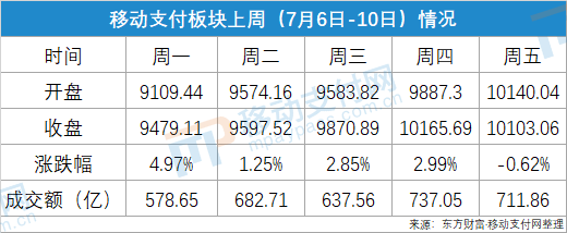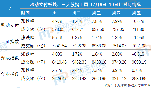 與三大股指走勢類似,7月6日-10日5個(gè)交易日中,移動支付板塊整體上漲,日均漲幅2.288%。成交額合計(jì)3327.83億元,日均669.6億元。