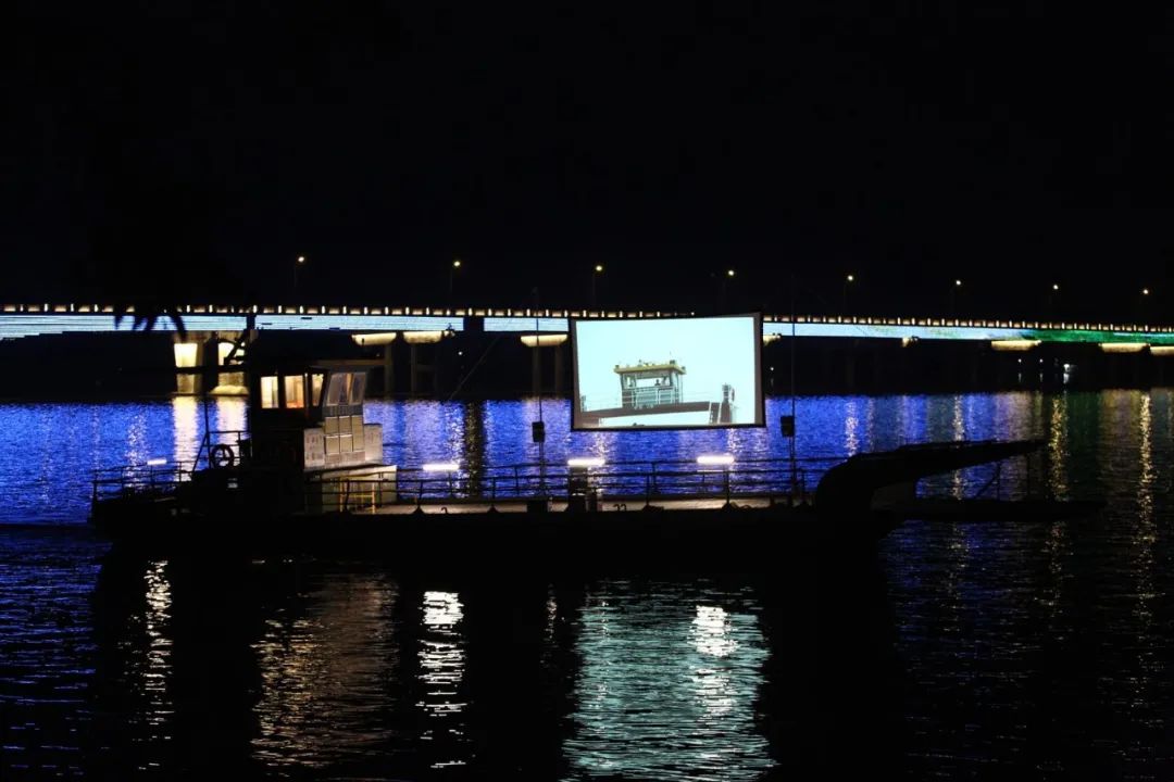 FIRST:船載著一張銀幕順流而下,《春江水暖》里那一段經(jīng)典的游泳長鏡頭忽隱忽現(xiàn),岸邊的人望向銀幕,凝視它遠(yuǎn)行,直到融進(jìn)整個城市的亮堂與暗涌里。除了表達(dá)電影向前,回到家鄉(xiāng)人面前放自己的電影,你對這件事的解讀是什么?