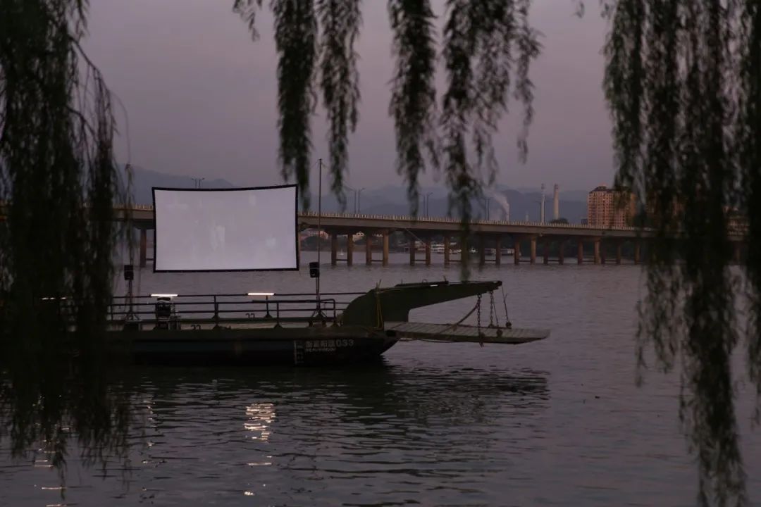 在船上搭銀幕,我們提前做了測試,主要是一些技術(shù)細(xì)節(jié)。我們是在對岸的島上搭的,偶爾要停下來躲雨,一邊等一邊吃飯,就和當(dāng)?shù)氐姆庞酬犼犻L閑聊。他70年代就到北電進(jìn)修,后來回富陽經(jīng)營電影院,也開演藝公司,經(jīng)歷豐富。聊到雨停,再去測試機(jī)器。
