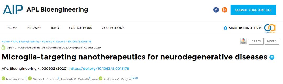 Nanxia Zhao, Nicola L. Francis, Hannah R. Calvelli, Prabhas V. Moghe. Microglia-targeting nanotherapeutics for neurodegenerative diseases. APL Bioengineering, 2020; 4 (3): 030902 DOI: 10.1063/5.0013178